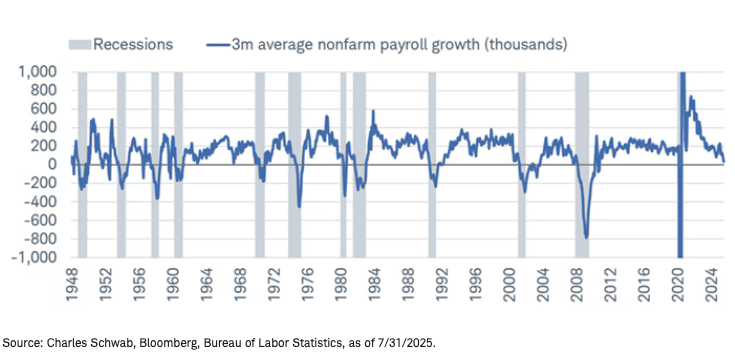 The 3 month average job growth metric is currently at a level that has consistently (but not every time) foreshadowed a recession.