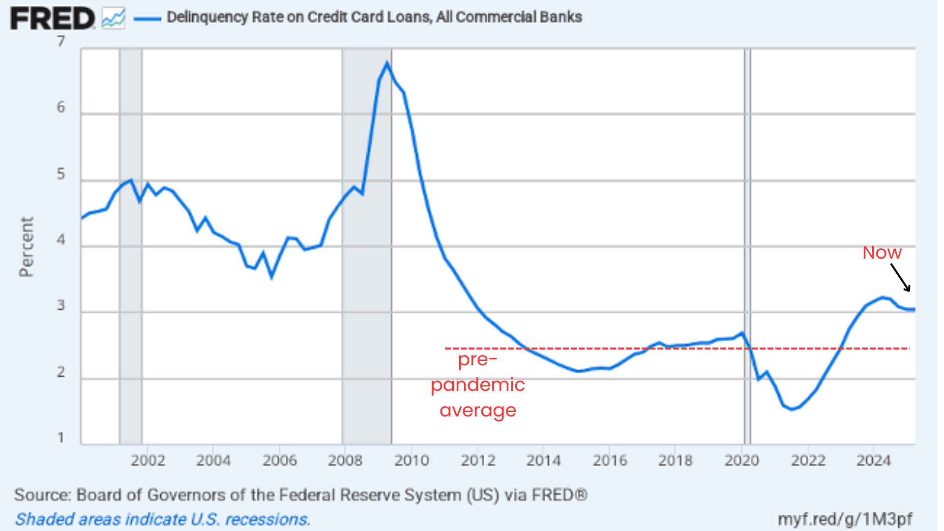 US Credit Card delinquencies are now at about 3% and have gone above the pre-pandemic average. If they climb to more than 4.5%, it would be a worrying sign of growing economic distress.