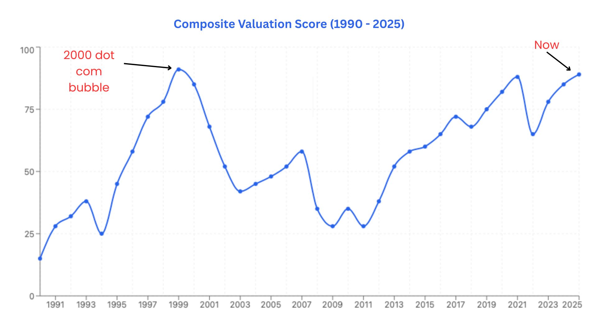 A score ~75 or higher indicates significant over-valuation with a high probability of poor 10-year returns.